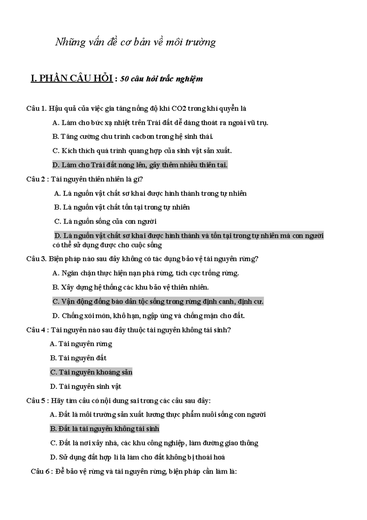 Câu hỏi trắc nghiệm về môi trường: 50 câu (MT. Trinh) - Studocu