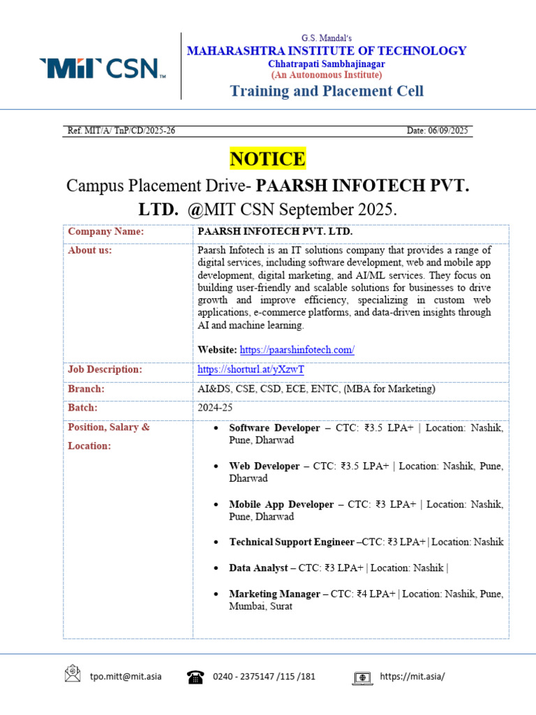 Notice - Campus Placement Drive - PAARSH INFOTECH PVT. LTD. | PDF ...