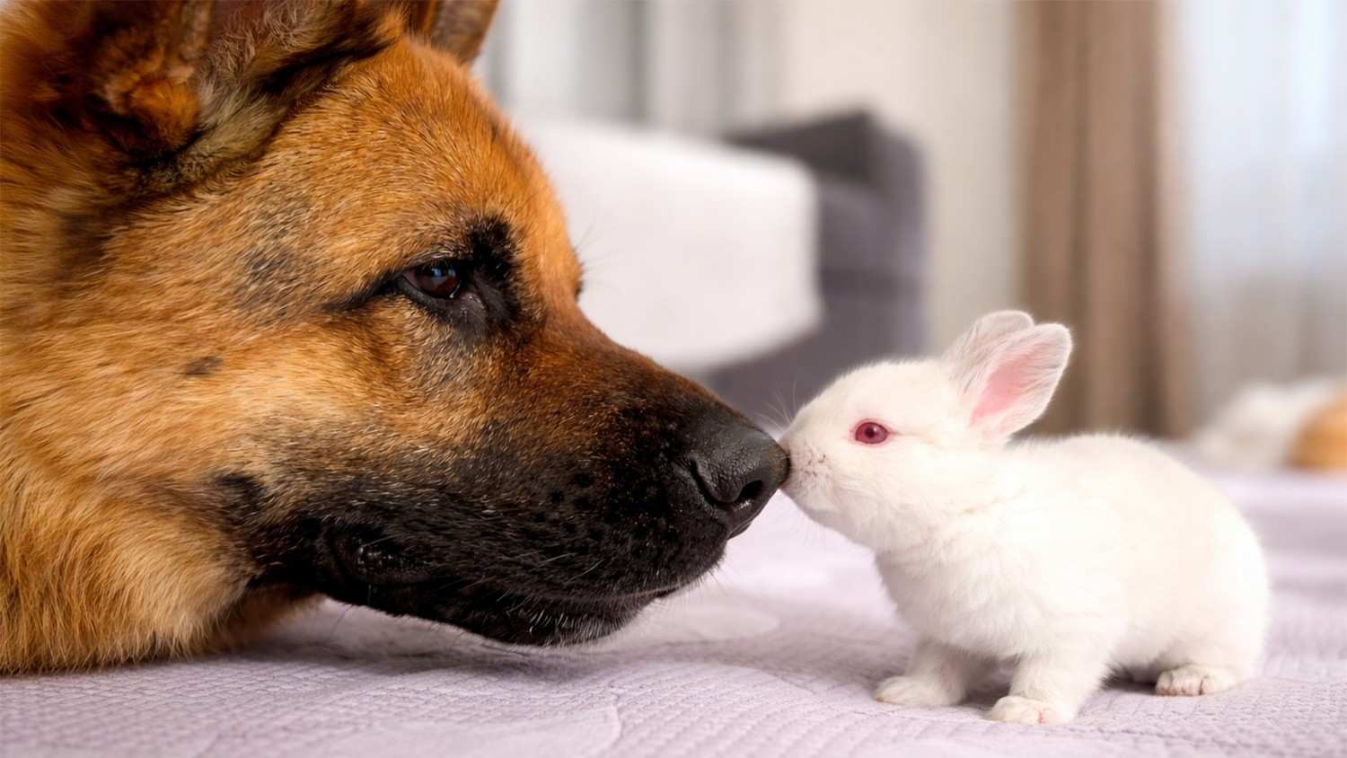 Tiny bunny wins staring contest with German shepherd