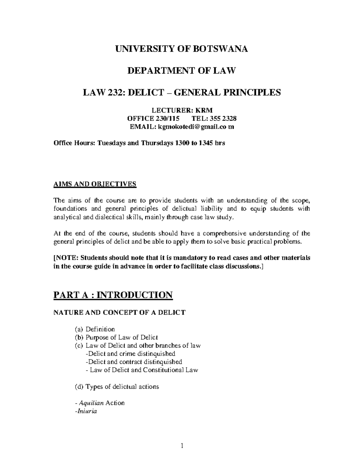 LAW OF Delict 232 Course Outline - UNIVERSITY OF BOTSWANA DEPARTMENT OF ...