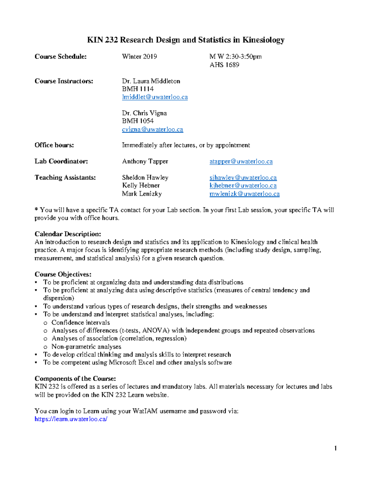 KIN-232-Course-Outline-W19 - KIN 232 Research Design and Statistics in ...