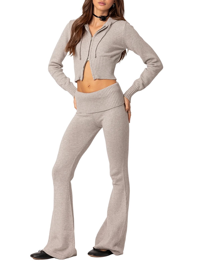 Womens Two Piece Knit Outfits Sweater Set Long Sleeve Zip Up Cropped ...