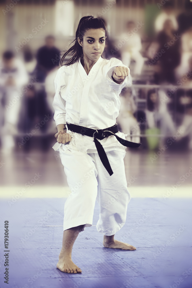 Beautiful brunette young woman wearing karate fighter uniform with ...