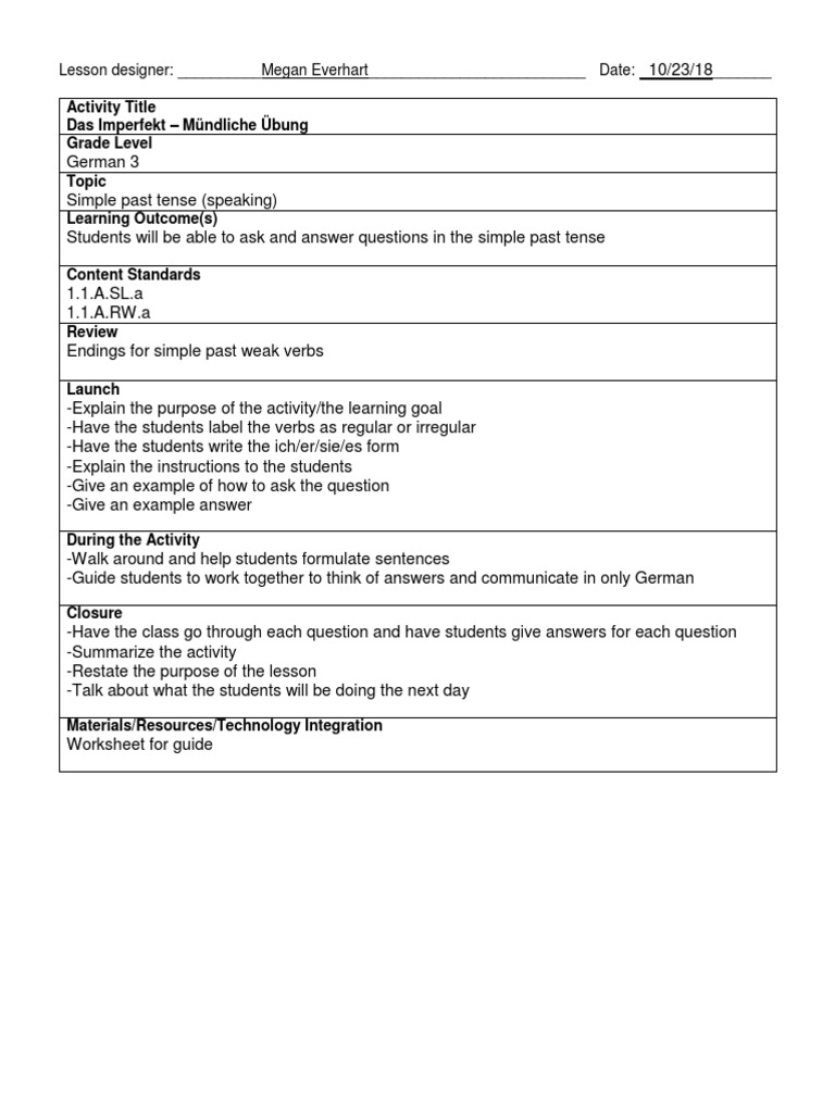 Week 2 lesson plan document - Teacher Candidate Name: Time: 1 hour Date ...