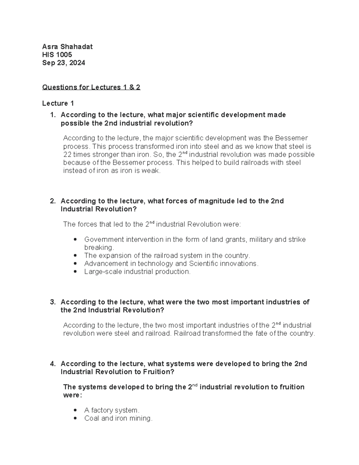HIS 1005 Lecture Notes: 2nd Industrial Revolution Insights - Studocu