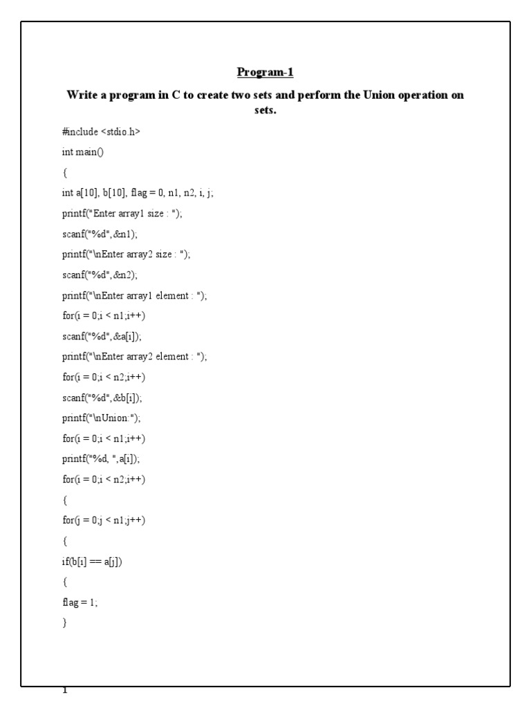 Program-1 Write A Program in C To Create Two Sets and Perform The Union ...