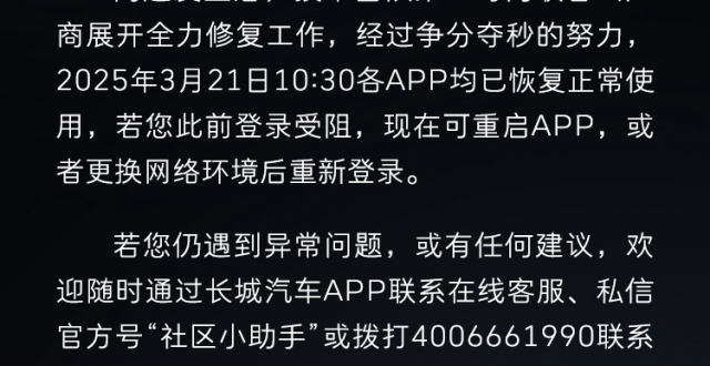 长城汽车对服务器“突发异常”致歉:各 App 均已恢复正常使用_腾讯新闻