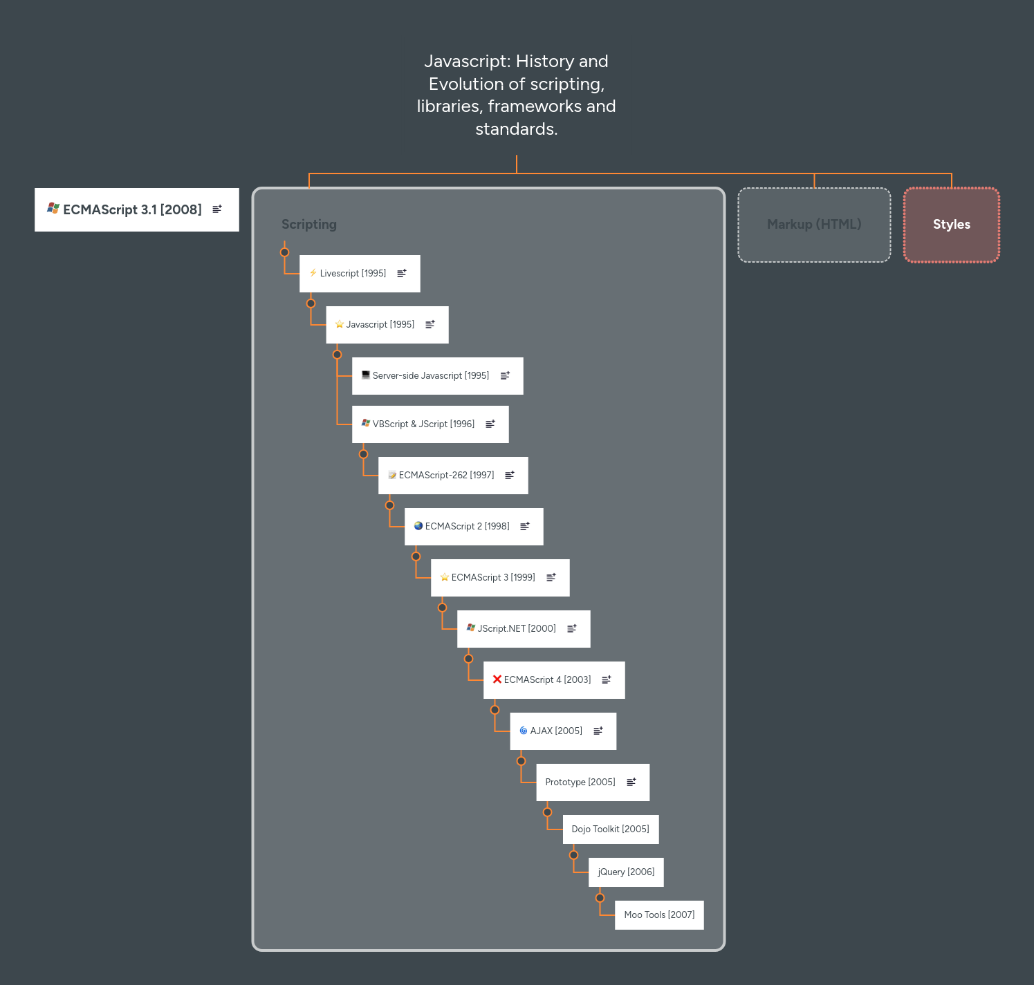 Based on this image's title: “Javascript: History and Evolution of scripting, l... | MindMeister Mind map”