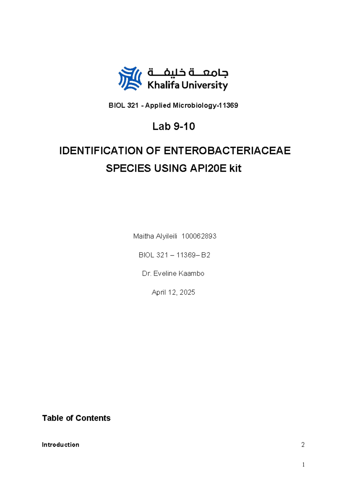 BIOL 321 Lab Report: Identification of Enterobacteriaceae Using API20E ...