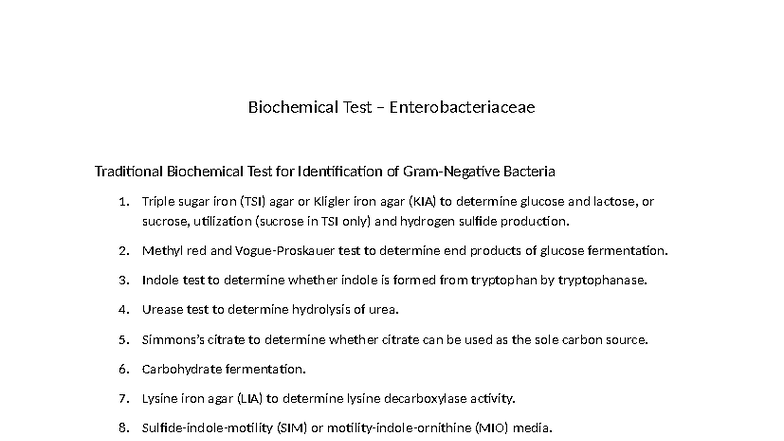 Biochemical Tests for Enterobacteriaceae Identification - Studocu
