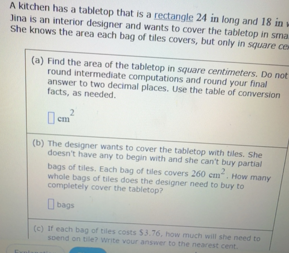 Solved: A kitchen has a tabletop that is a rectangle 24 in long and 18 ...