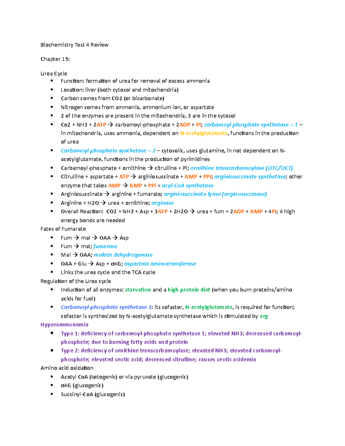 Exam 4 Review sheet - Biochemistry Test 4 Review Chapter 19: Urea Cycle ...