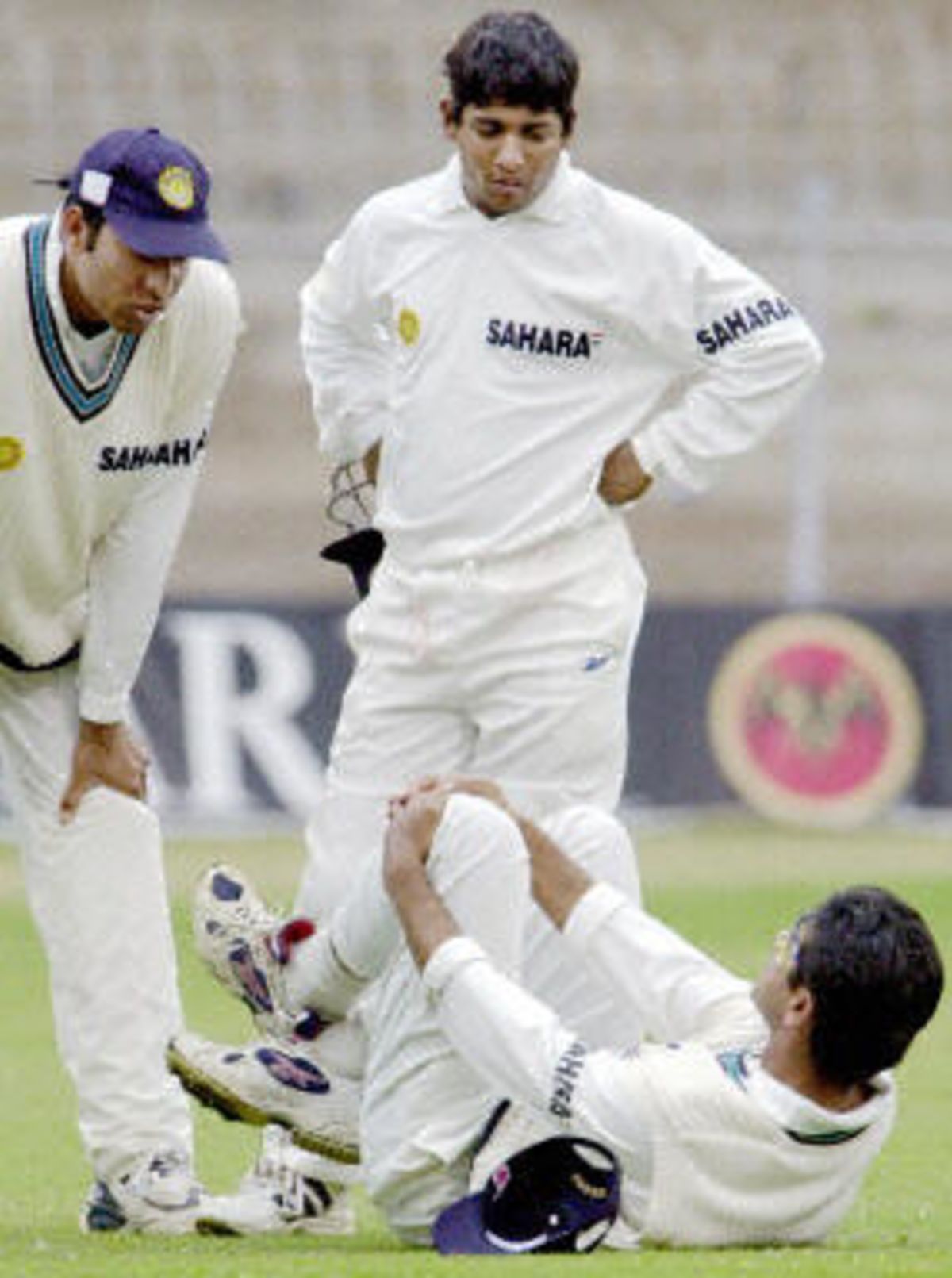 Rahul Dravid after being struck in the field. Laxman, left, and Das ...