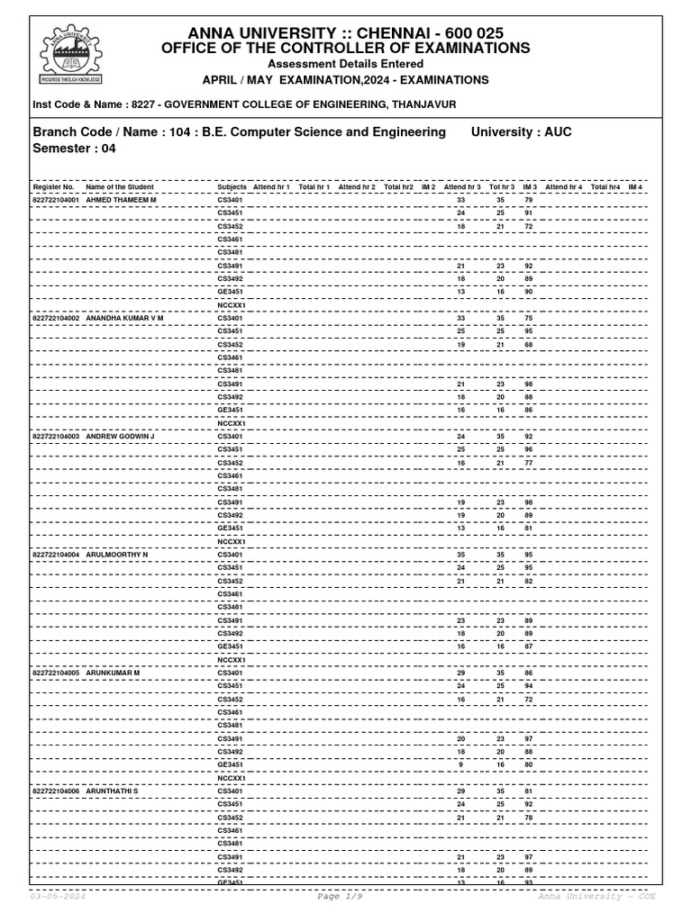 Anna Univ CSE Exam Results 2024 | PDF
