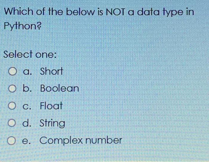 Solved Which of the below is NOT a data type in Python? | Chegg.com