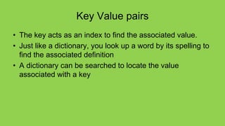 Dictionaries - Dictionaries Dictionary holds key:value pair. Key-Value ...