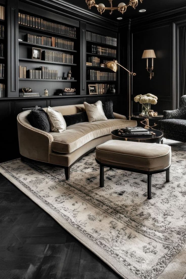Luxurious Dark Academia Living Room with Black Leather Sofa, Vintage ...