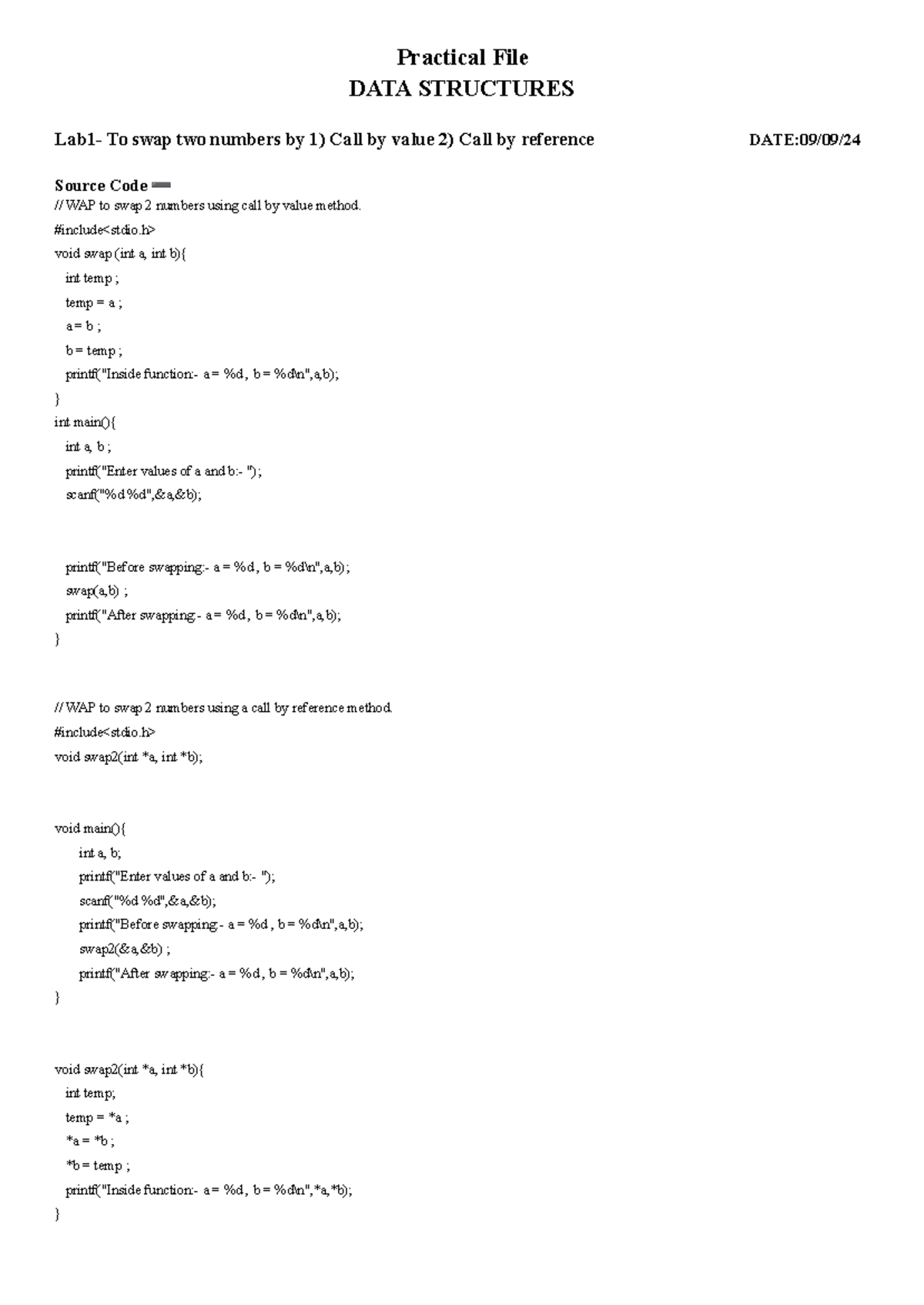 DS File - Lab notes - Practical File DATA STRUCTURES Lab1- To swap two ...