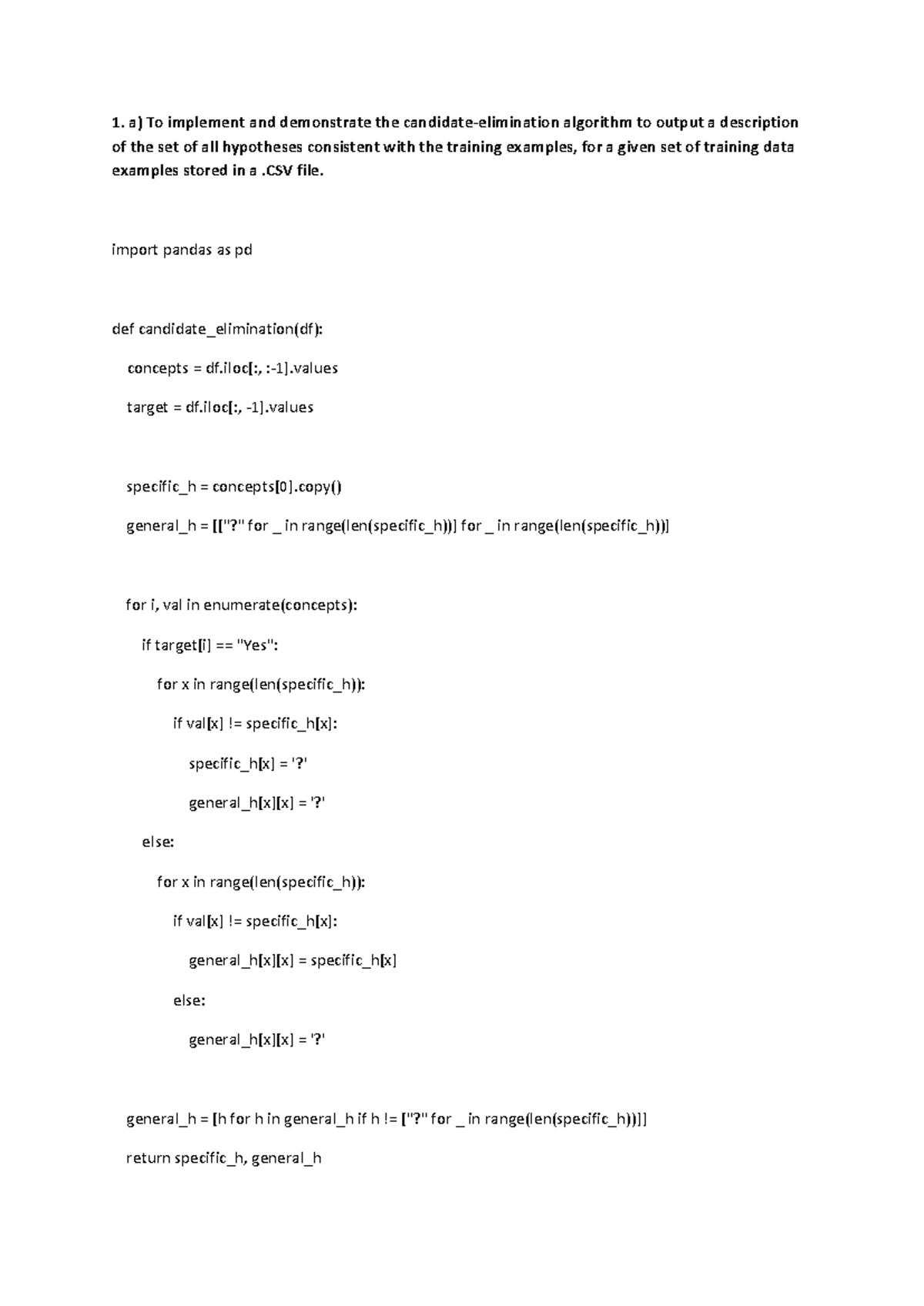 ML lab program 1 - Experiment 1 1. Implement and demonstrate the FIND-S ...