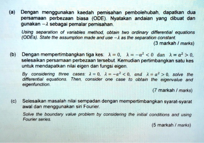 SOLVED: (a) Dengan menggunakan kaedah pemisahan pembolehubah, dapatkan ...