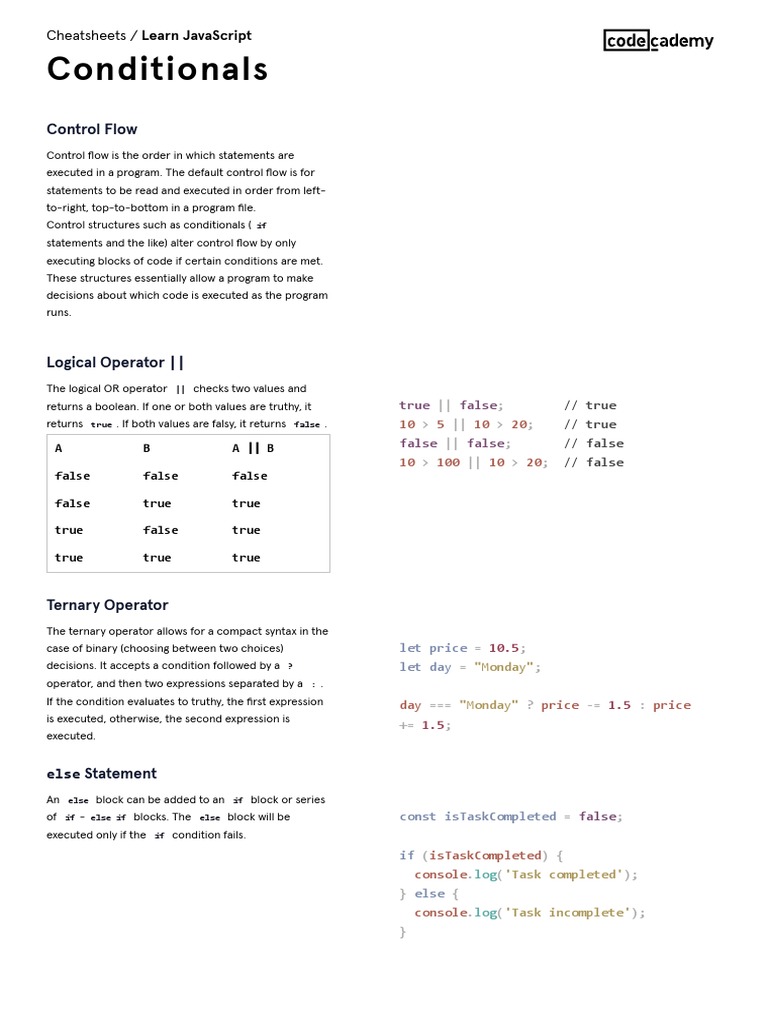 Learn JavaScript - Conditionals Cheatsheet - Codecademy | PDF ...