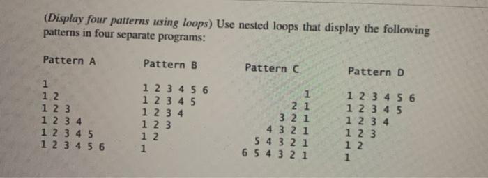 Solved (Display four patterns using loops) Use nested loops | Chegg.com