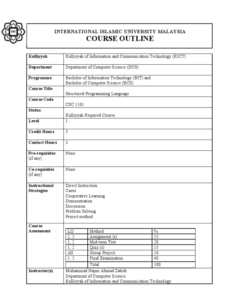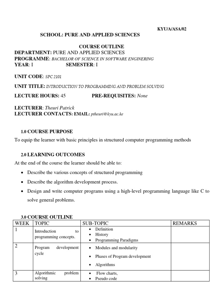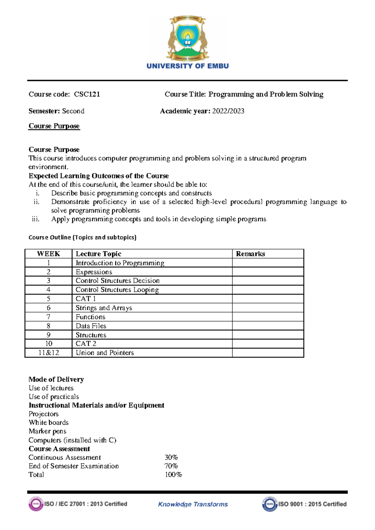CSC121 Programming & Problem Solving Course Outline - 2022 - Studocu
