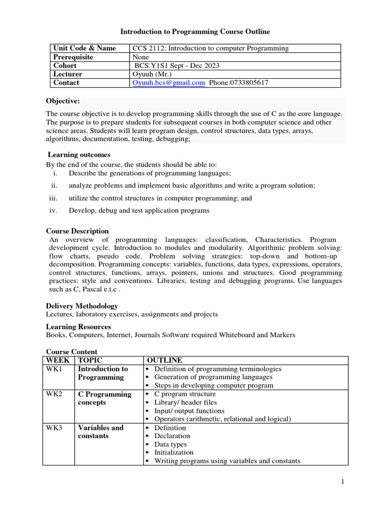 CCS 2112 Introduction To Computer Programming OUTLINE BCS | PDF ...