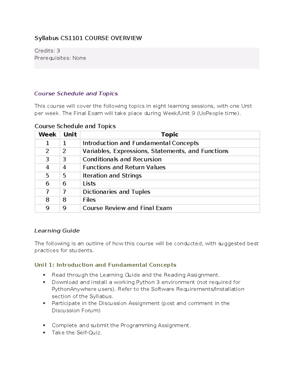 CS 1101 Programming Fundamentals Syllabus Overview and Objectives - Studocu