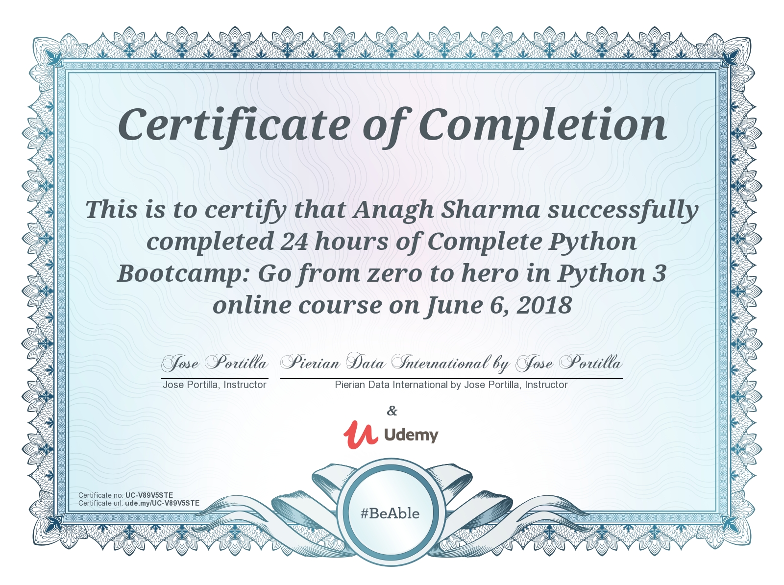 Certificate โ Python 3: Project-based Python, Algorithms, Data ...