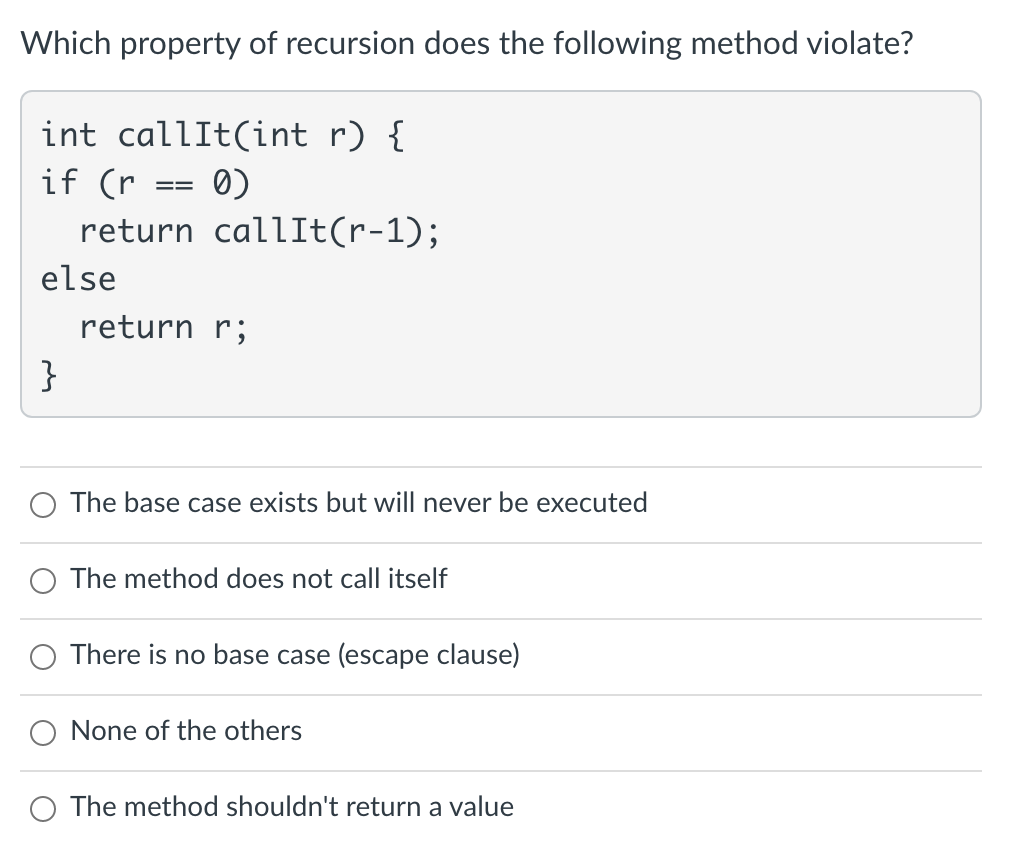 Solved Which property of recursion does the following method | Chegg.com