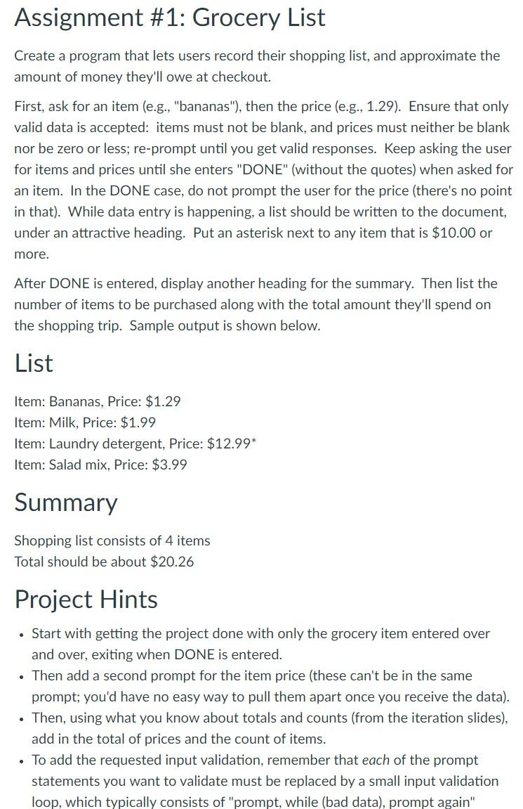 Solved Assignment #1: Grocery List Create a program that | Chegg.com