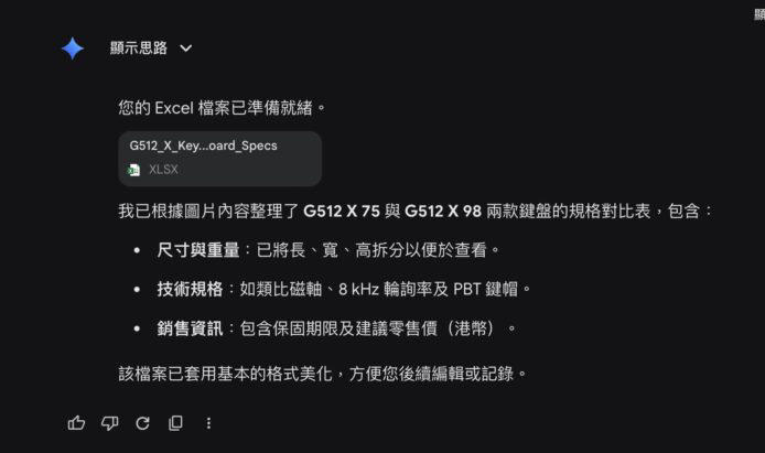 Gemini 可直接生成Excel, PDF 檔案 紙面複雜表單 影相後即成Excel表
