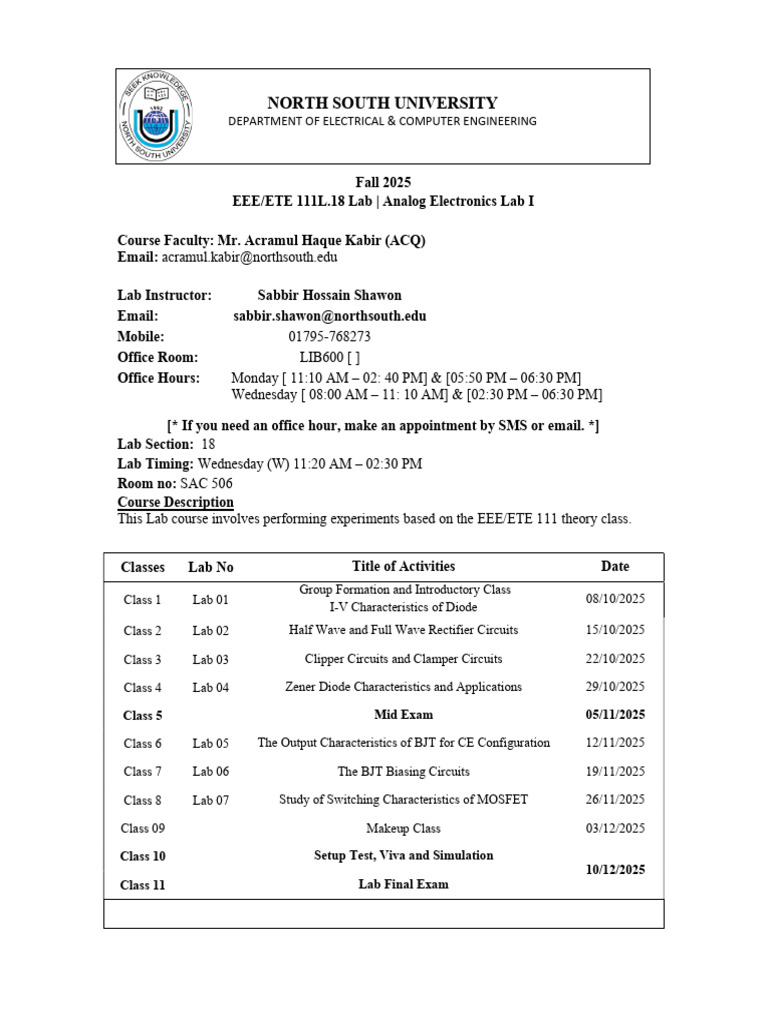 EEE111L.18 CourseOutline Fall 2025 | PDF | Experiment | Electrical ...