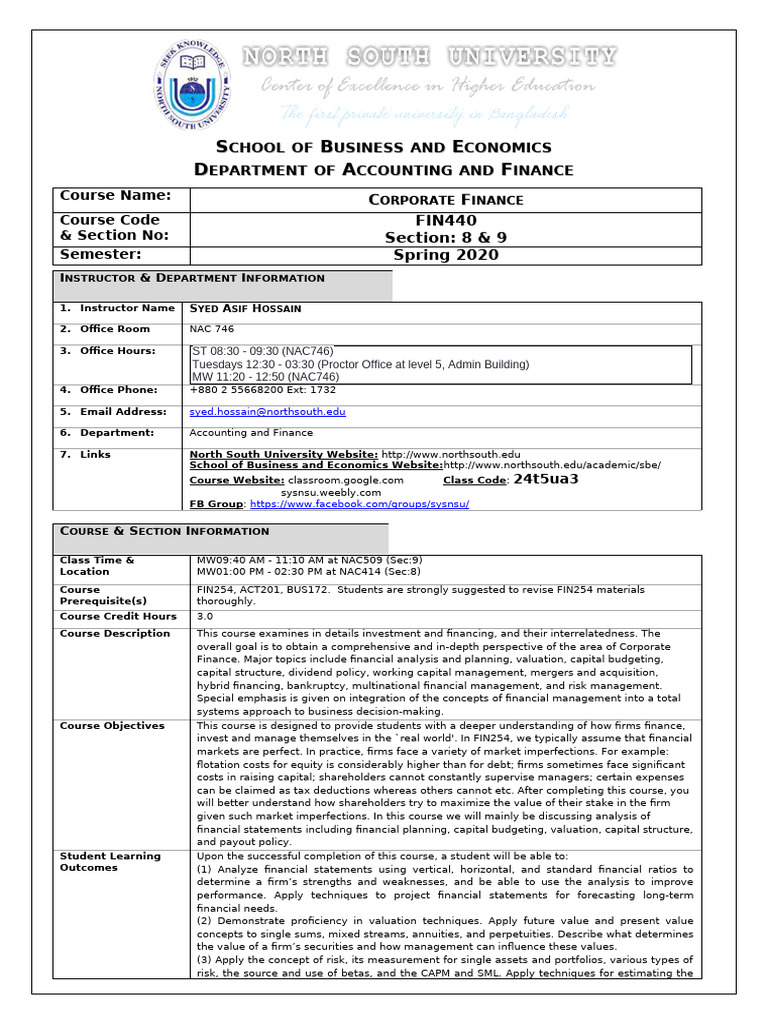 Fin440 Courseoutline Spring2020 | PDF | Valuation (Finance) | Net ...