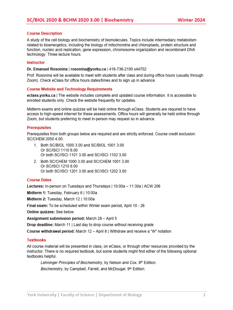 B2020 24w CourseOutline ERosonina v1-1 | PDF | Metabolism | Proteins