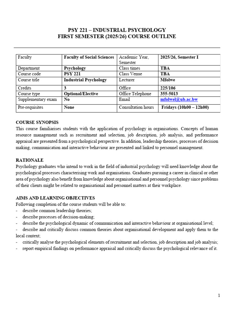 PSY221 CourseOutline 2025 | PDF | Industrial And Organizational ...