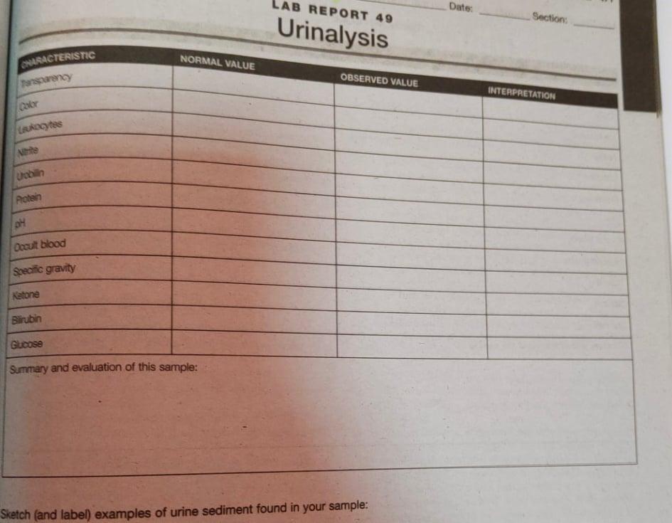 Solved LAB REPORT 49 Date: Section Urinalysis NORMAL VALUE | Chegg.com