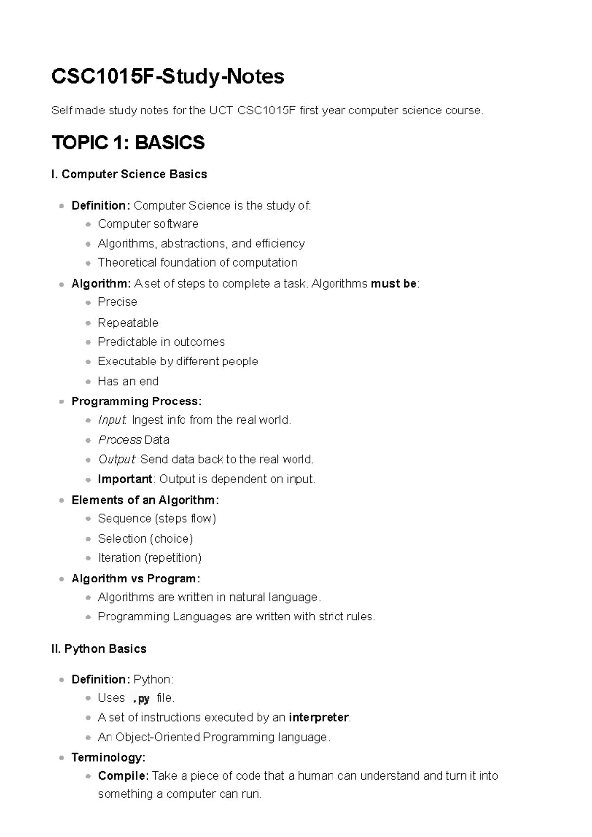 Study Notes for Computer Science 1015 (Intro to Programming) UCT ...