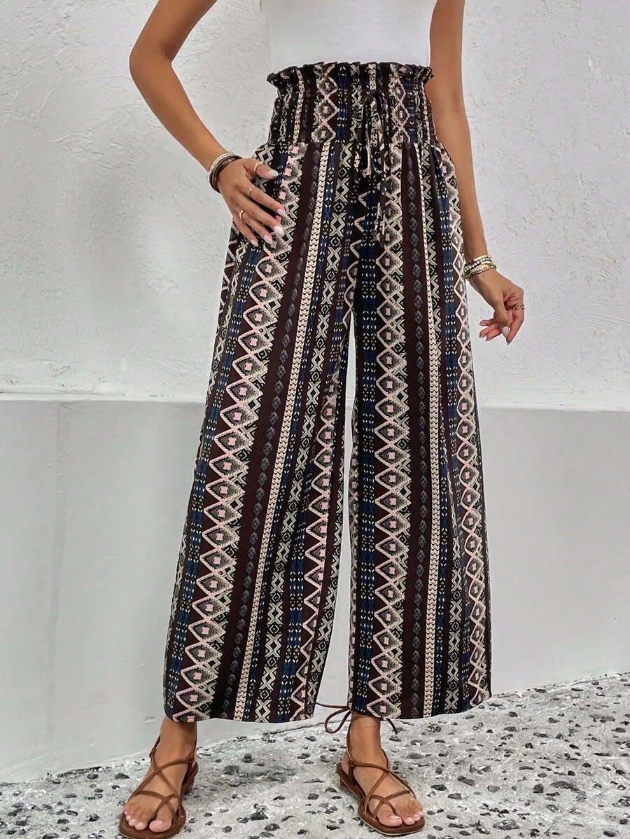 SHEIN LUNE Geo Print Paperbag Waist Wide Leg Trousers | SHEIN UK