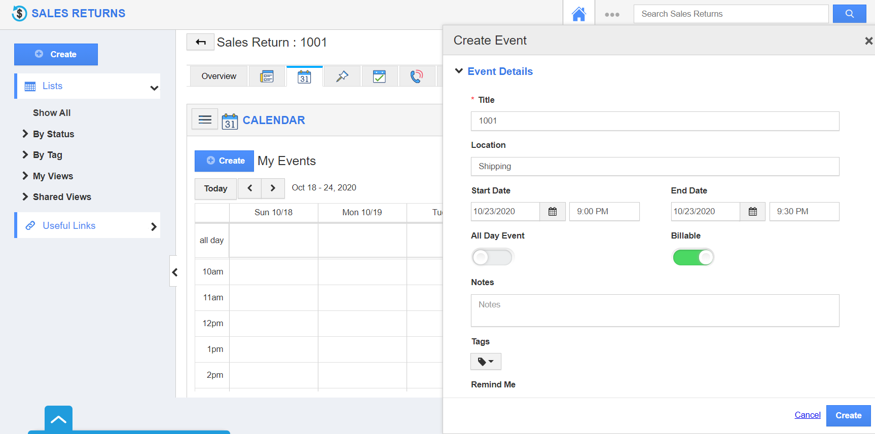 How to create an event with the sales return information?