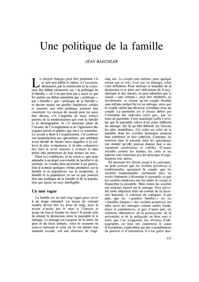 Une politique de la famille - Commentaire