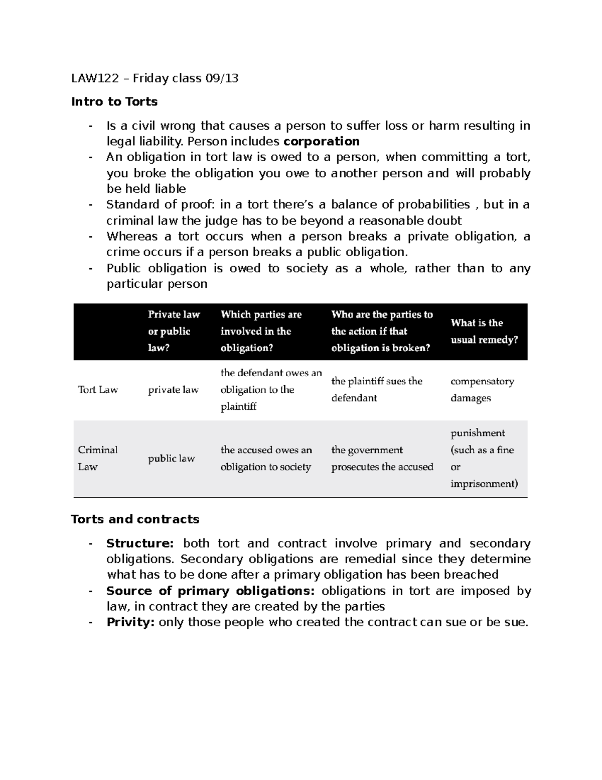 WEEK 2 - Class notes - LAW122 – Friday class 09/ Intro to Torts - Is a ...