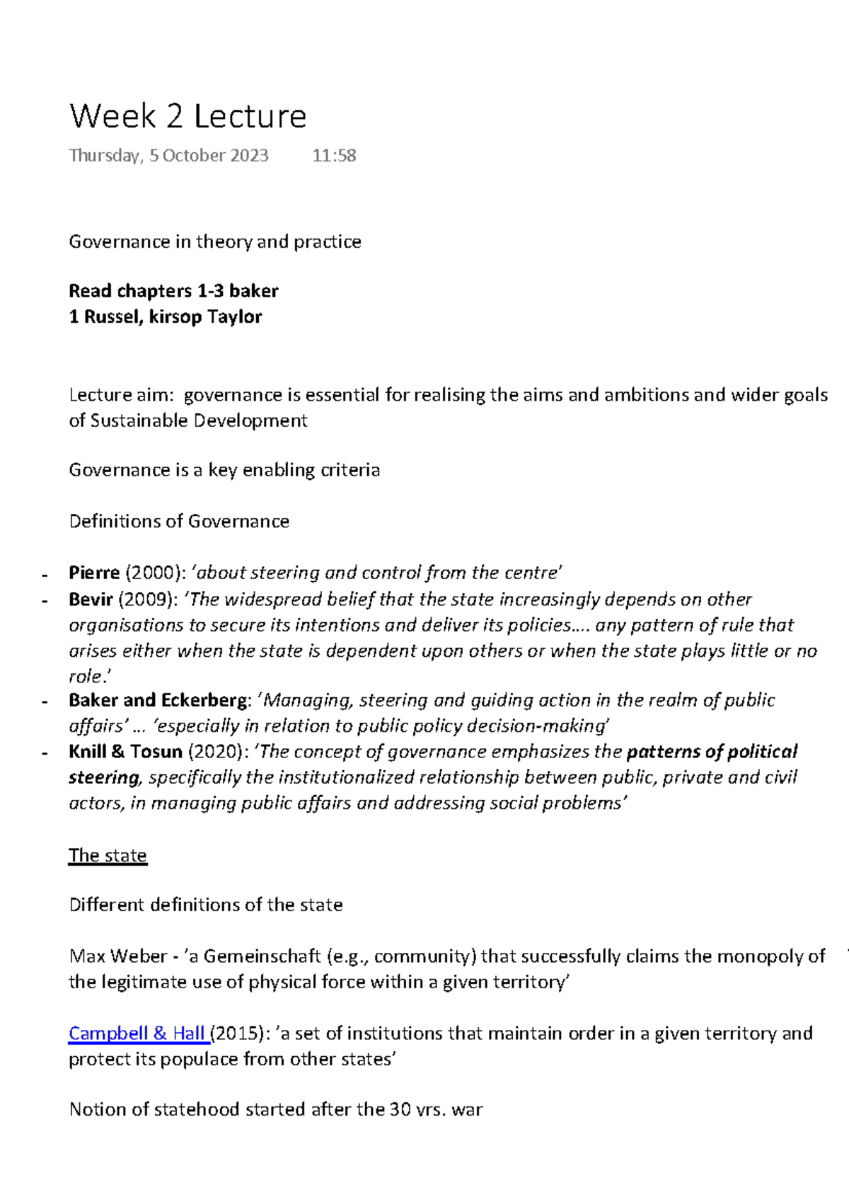 Week 2 Lecture Notes - Governance in theory and practice Read chapters ...