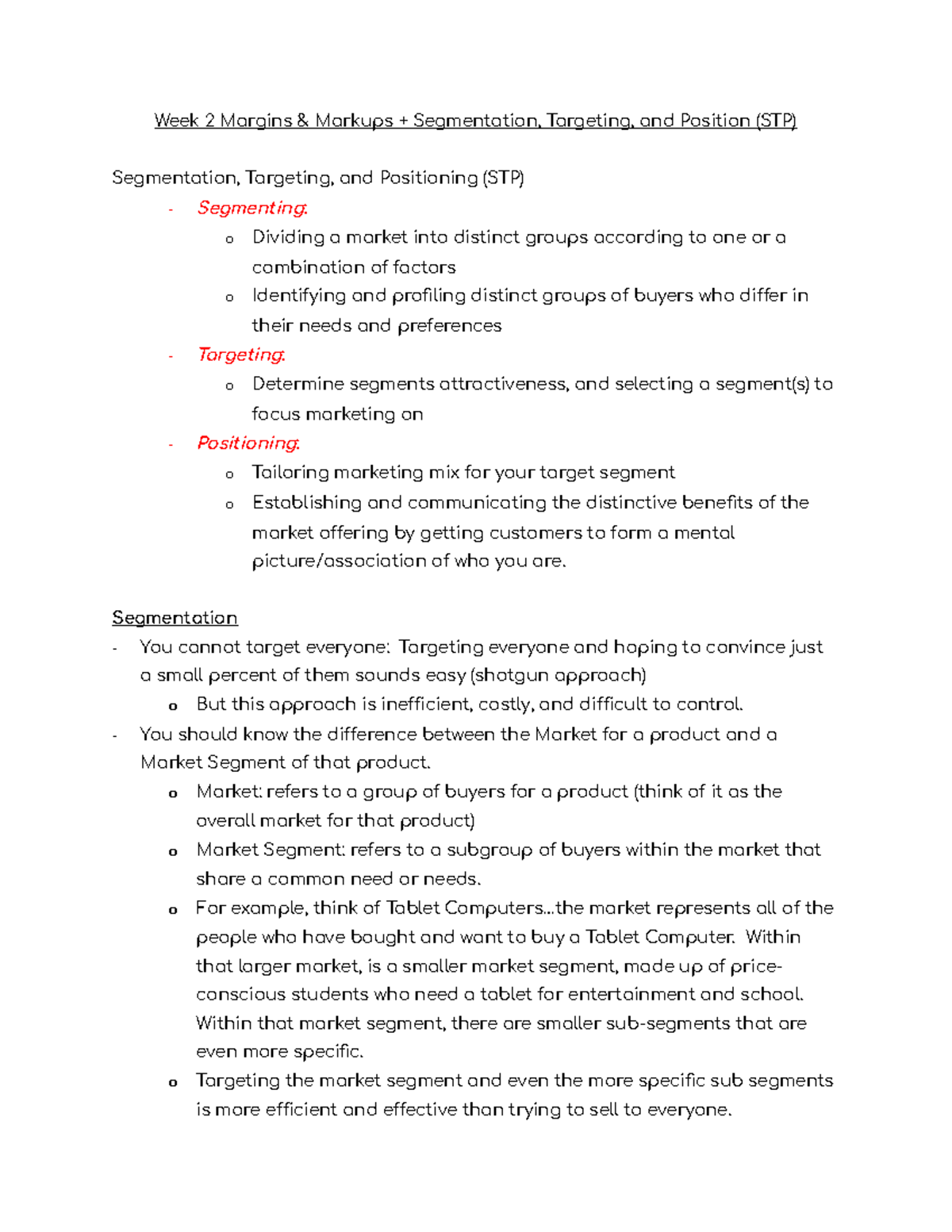 MKT 300 Week 2 Class Notes - Week 2 Margins & Markups + Segmentation ...