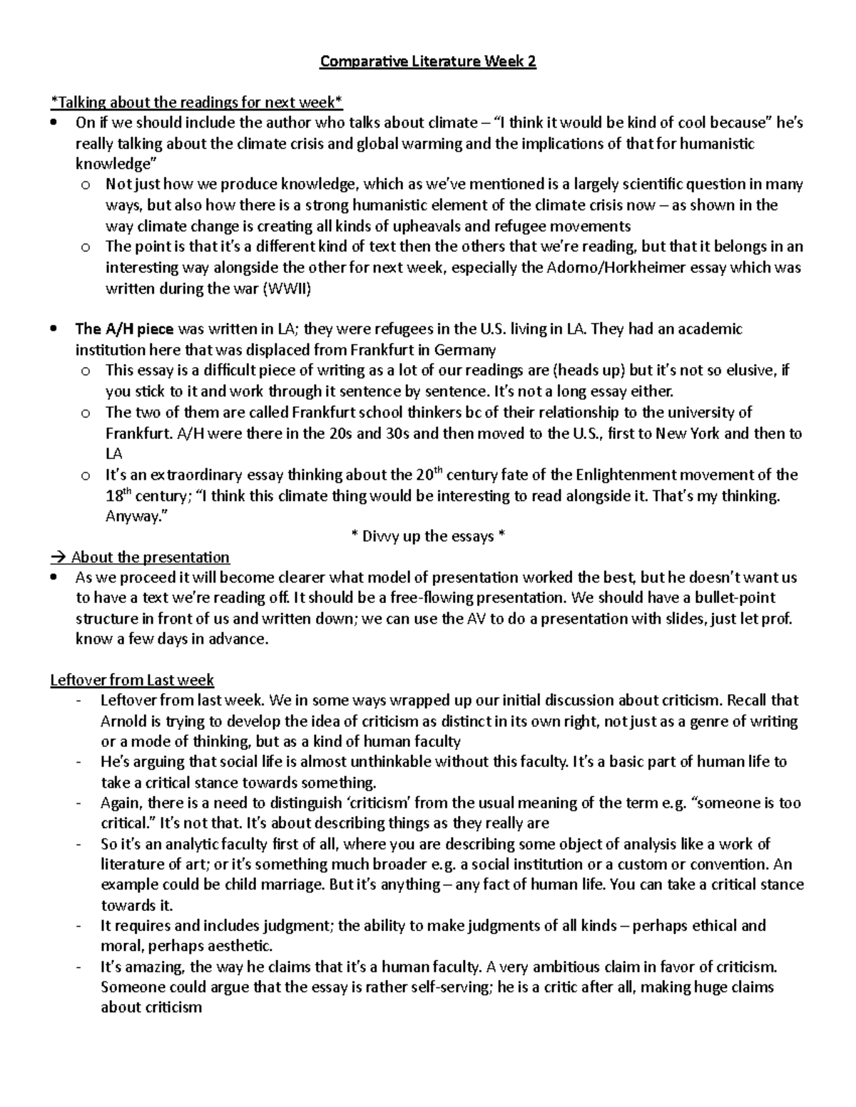 Week 2 Lecture notes - Comparative Literature Week 2 Talking about the ...