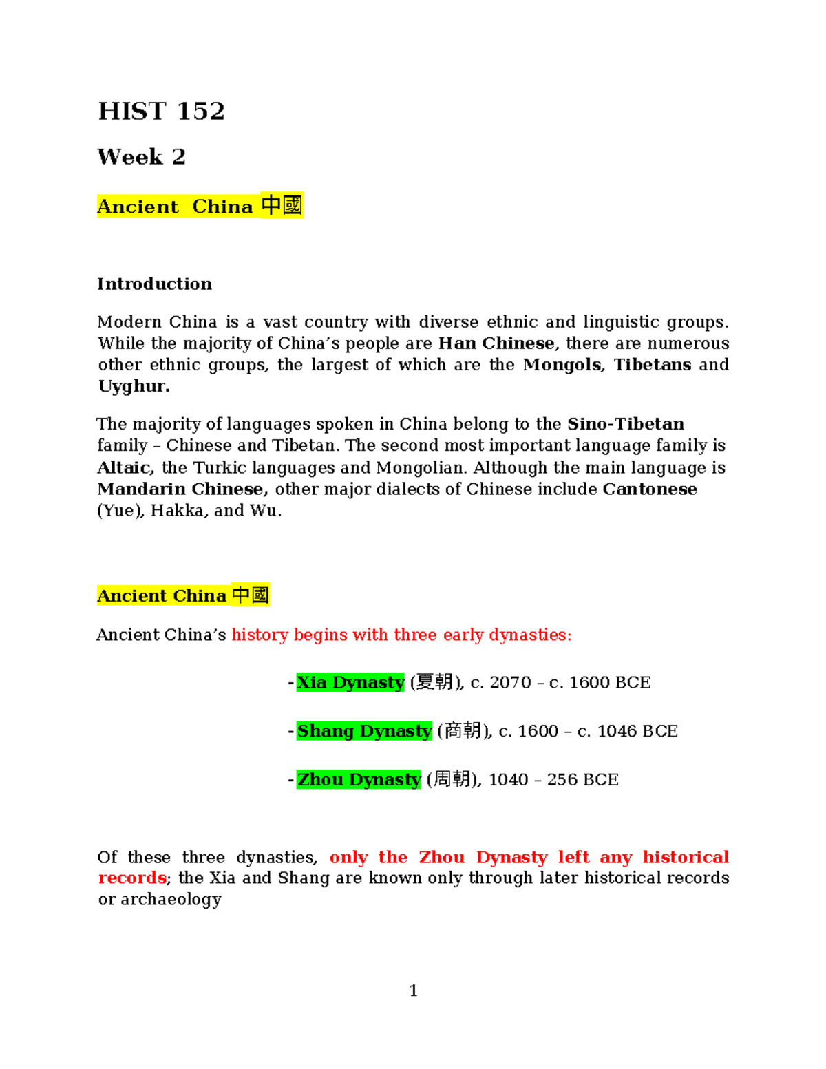HIST 152 Week 2 Class Notes: Ancient China Overview 中國 - Studocu