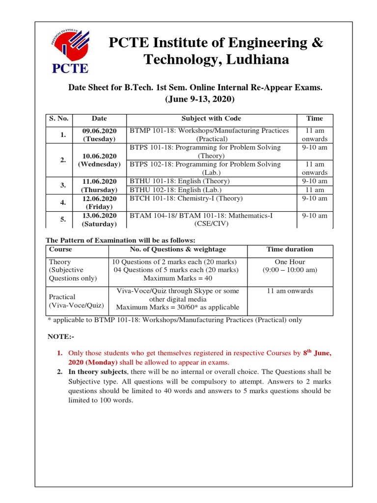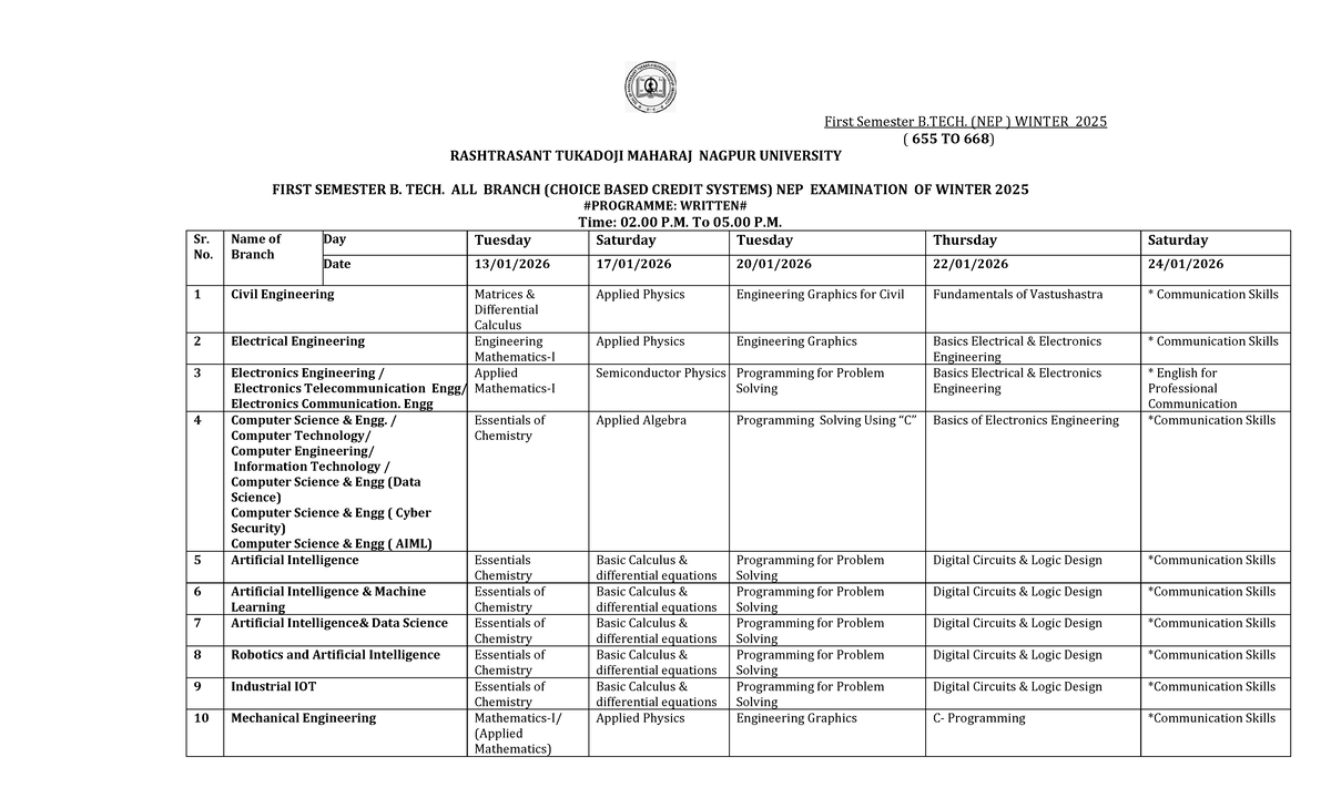 B.TECH. 1st Sem. (NEP) Winter 2025 Exam Schedule & Details - Studocu
