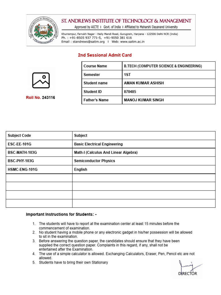 B.Tech 1st Sem Exam Admit Card | PDF