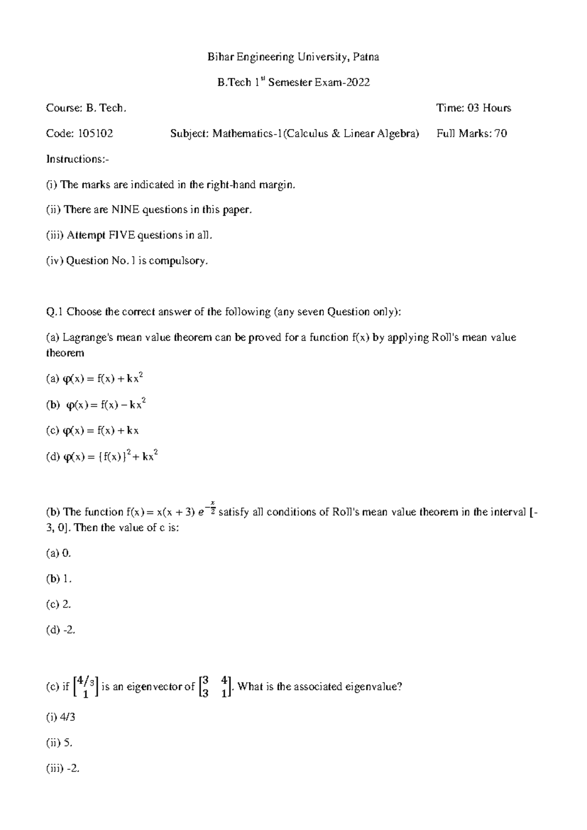 B.Tech 1st Sem Mathematics I: Calculus & Linear Algebra (105102) Exam ...